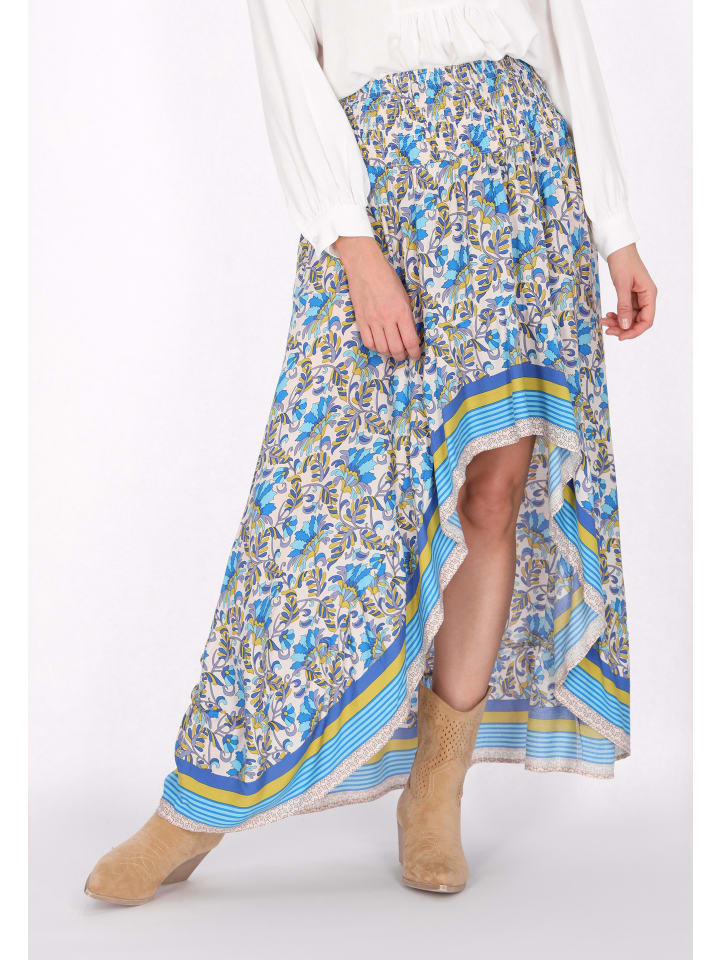 Enhance your boho chic style with this maxi skirt from our Fashion Look collection. The skirt showcases a loose fit and an elastic waistband for a comfortable fit. It features an elongated back and a ruffled cutout at the front, creating a fashionable and stylish look. The skirt is decorated with a captivating floral print, adding an ethno-inspired touch.