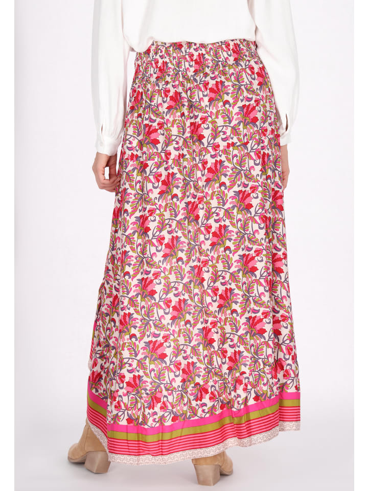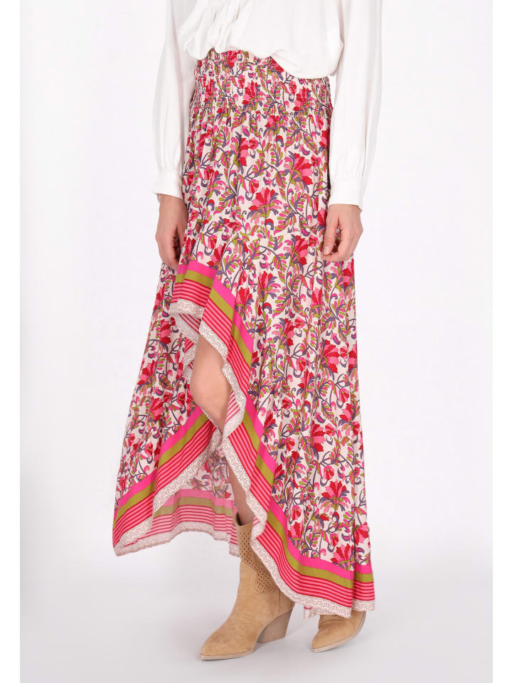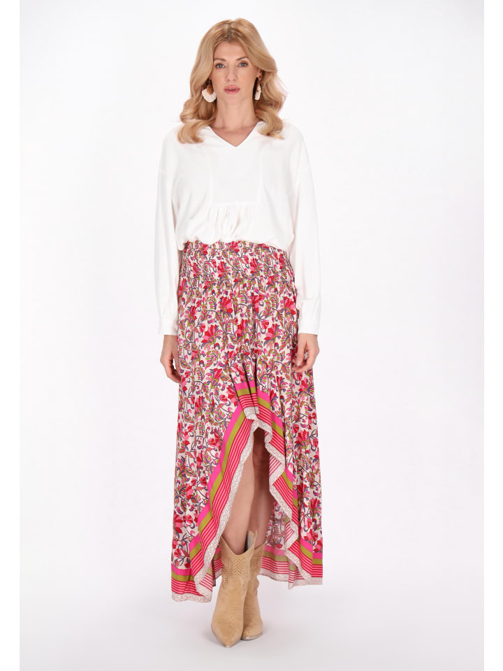 Enhance your boho chic style with this maxi skirt from our Fashion Look collection. The skirt showcases a loose fit and an elastic waistband for a comfortable fit. It features an elongated back and a ruffled cutout at the front, creating a fashionable and stylish look. The skirt is decorated with a captivating floral print, adding an ethno-inspired touch.