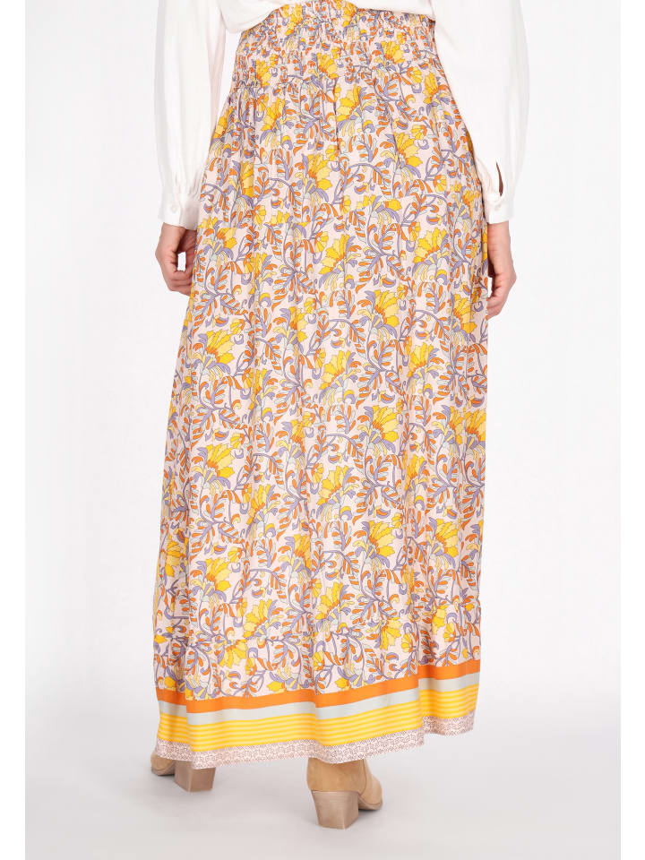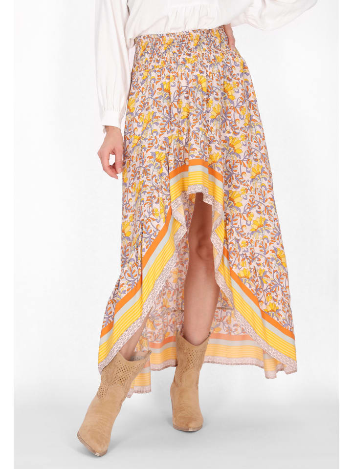 Enhance your boho chic style with this maxi skirt from our Fashion Look collection. The skirt showcases a loose fit and an elastic waistband for a comfortable fit. It features an elongated back and a ruffled cutout at the front, creating a fashionable and stylish look. The skirt is decorated with a captivating floral print, adding an ethno-inspired touch.