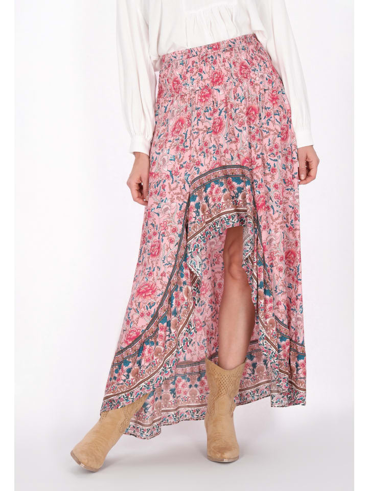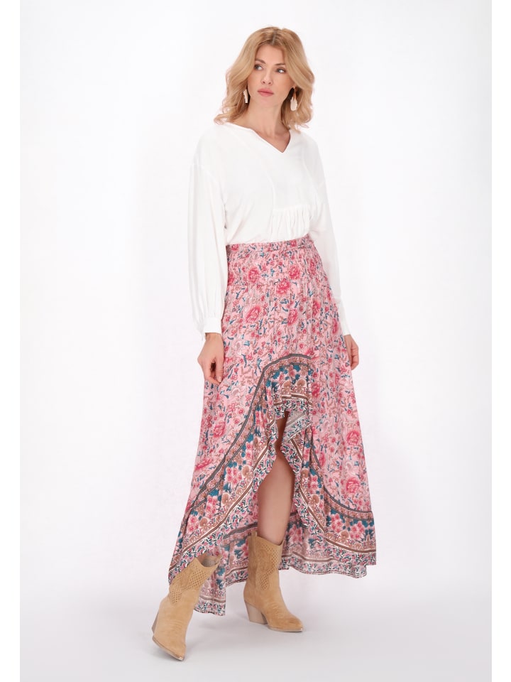 This stylish midi skirt has a regular fit with an elongated back and fun ruffles with a front cutout for a chic look. The elastic waistband provides comfort, and the woven fabric flows beautifully. Decorated with vibrant floral prints and ornaments, this fashionable skirt embodies an elegant boho-ethnic aesthetic, perfect for casual outings or semi-formal events. This skirt is part of the Fashion Look Collection.