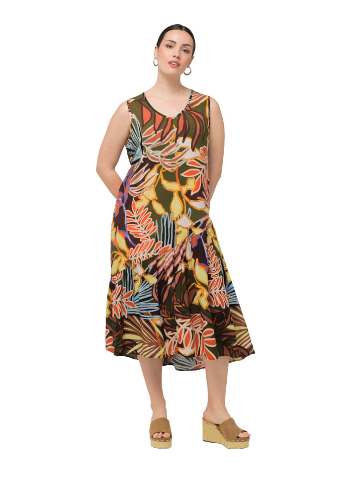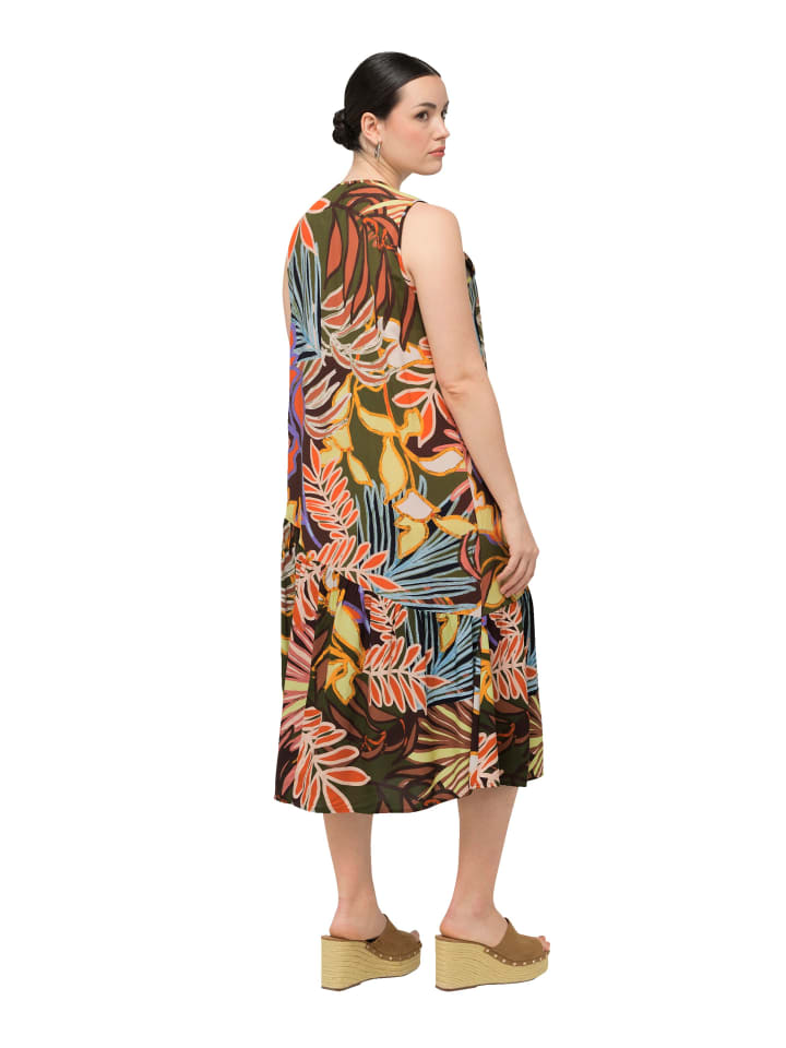 Платье А-силуэта без рукавов из мягкого вискозы с принтом в виде листьев и косым воланом по подолу. V-образный вырез, широкий распашной подол.материал