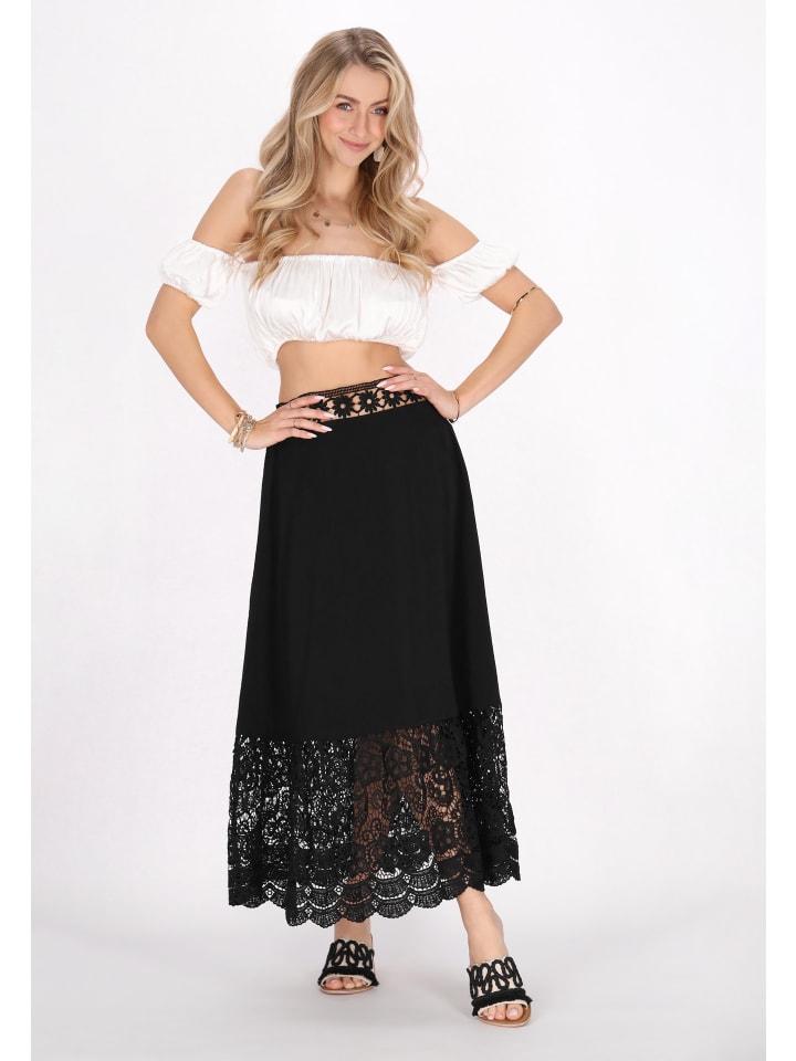 This stunning maxi skirt is designed with a boho-chic aesthetic in mind. It features lace panels at the waist and at the bottom of the skirt showcasing a floral pattern, so it embodies ethno chic. The regular cut provides comfort, while the elastic waistband ensures ease of wear. The A-line silhouette makes it perfect for any festival collection or casual outing. This skirt is part of the Festival Collection.