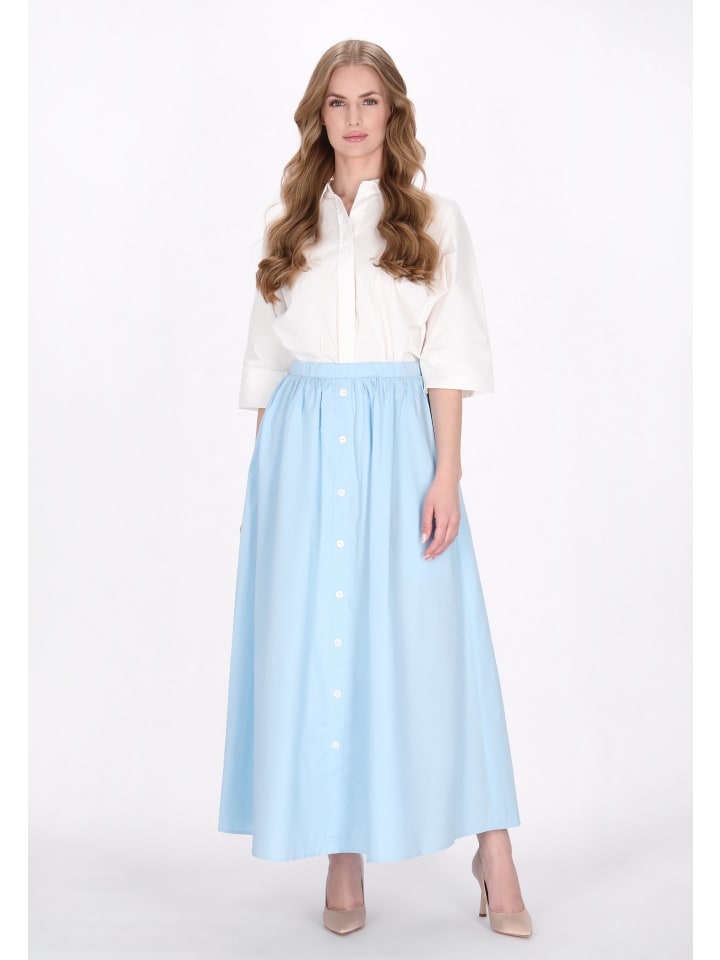 Introducing a versatile A-Line Skirt, perfect for your wardrobe. This regular fit maxi piece features an elastic waist for comfort and buttons down the front that enhance its style. Crafted from woven fabric, it offers a smooth silhouette with subtle creases, making it ideal for casual business or back-to-office outfits in our Classic Look Collection.