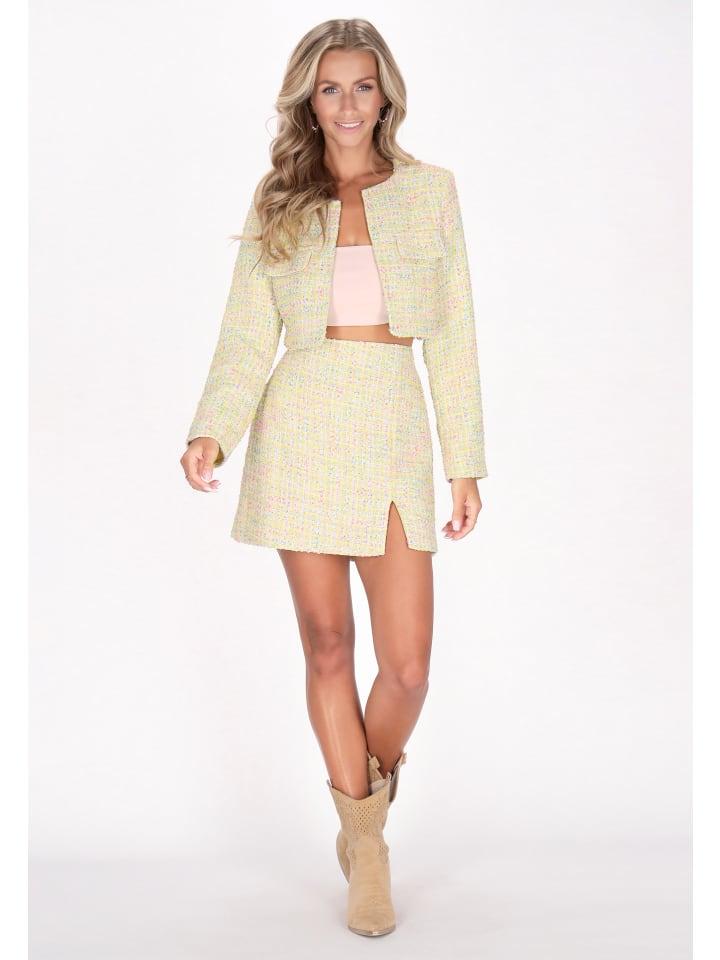 Discover a stylish lightweight jacket with a regular fit, cropped silhouette and elegant round neckline. This fashionable jacket has long sleeves and lapels that add a chic touch. A convenient hook and eye closure allows for easy wearing, while the woven Boucle pattern adds a chic touch to everyday fashion. It is part of the Fashion Look Collection.