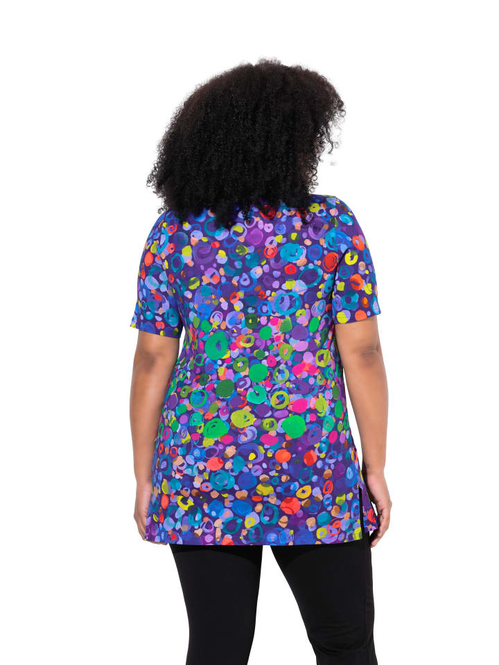 Длинная рубашка А-силуэта из мягкого трикотажа со сплошным принтом. Круглый вырез с маленькой замочной скважиной, полурукавка. Удобный подол с разрезами по бокам.материал