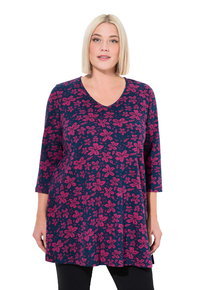 Длинная рубашка А-силуэта из мягкого трикотажа с цветочным принтом. V-образный вырез, рукава 3/4. Удобный подол с разрезами по бокам.материал