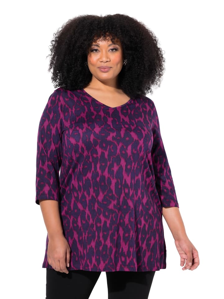 Длинная рубашка А-силуэта из мягкого трикотажа со сплошным принтом. V-образный вырез, рукава 3/4. Удобный подол с разрезами по бокам.материал