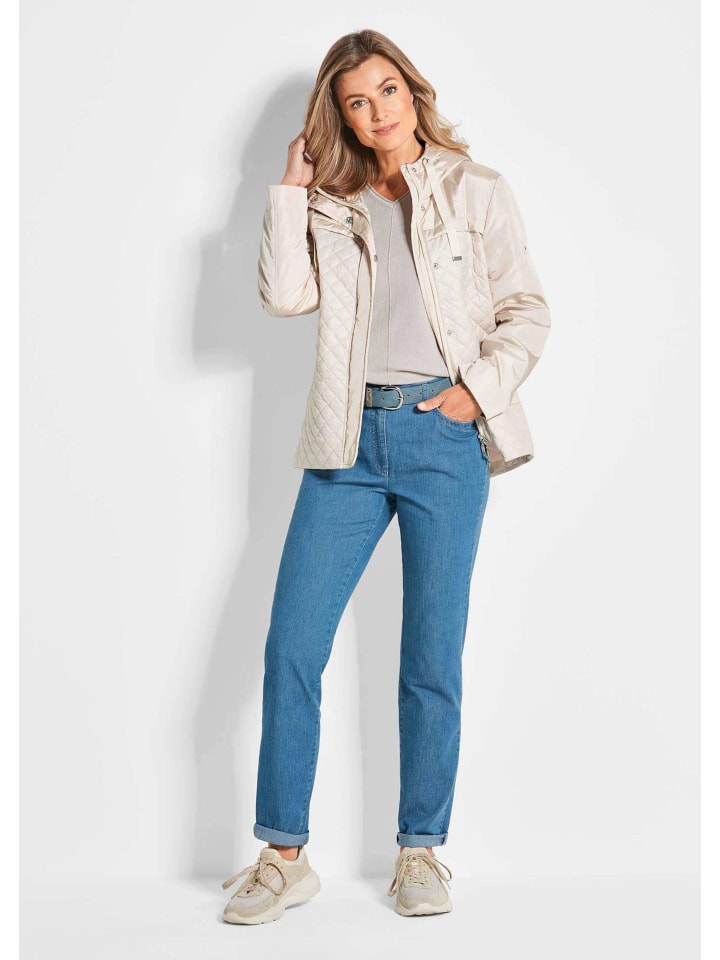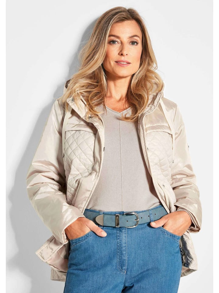 Куртка в изысканном стеганом стиле. Чередование элегантной стеганой ткани в ромбовидном стиле спереди и сзади и гладких вставок по фигуре, капюшону, пуговицам и рукавам делает куртку привлекательной. Но модель не только хорошо выглядит, но и надежно защищает от ветра и непогоды благодаря высокому воротнику, скрытой планке на пуговицах на молнии и удлиненной посадке сзади. С карманами для рук и 2 внутренними карманами для подкладки. Капюшон с тональными полосами в рубчик с надписью GOLDNER. Длина около 76 см в Gr. 46, около 72 см в Gr. 23.