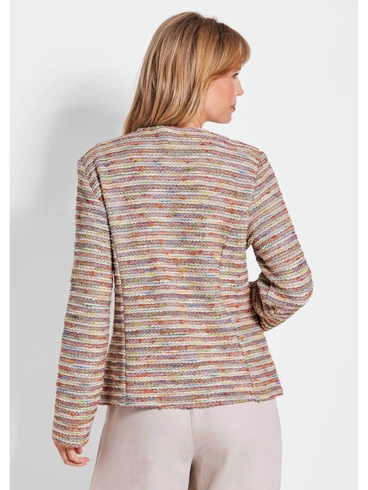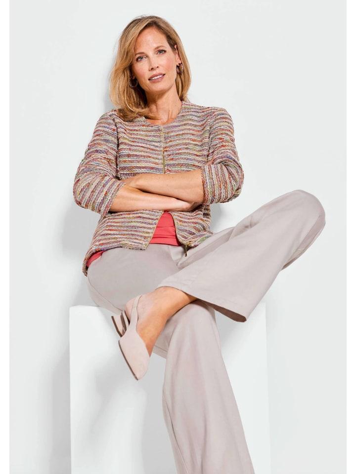 Куртка в стиле букле. Гармоничный многоцветный образ с ноготками особенно красиво подчеркивает текстуру ткани. Эластичный трикотаж из хлопка и вискозы очень удобен в носке. С золотой застежкой-молнией и круглым вырезом. Облегающий крой с придающими форму приталенными швами спереди и сзади. Эта модель - настоящий фаворит универсалов на все случаи жизни! Длина ок. 62 см в гр. 46, около 59 см в гр. 23.