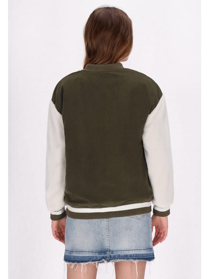 Introducing a baseball jacket with a relaxed fit and ribbed collar. Featuring long sleeves with drop shoulder design and snap buttons for easy closure. Includes pockets, ribbed hem, and a mix of corduroy and fleece materials for a patchwork look. Perfect for young fashion enthusiasts looking for comfy sportswear in the Back To School Collectio