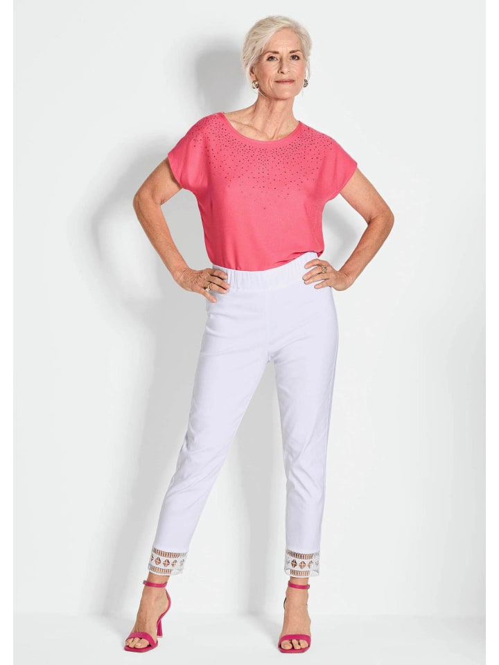Брюки-слипоны ЛУИЗА с гладким облегающим поясом, которые не только стильны, но и удобны. Широкий пояс и эластичный, не требующий особого ухода, гарантируют это. Элегантный штрих придают складки на косточках спереди и сзади. Подол брюк украшает красивая кружевная кайма: самое привлекательное зрелище в сезоне! Ширина подола около 36 см. Узкий обхват штанин.