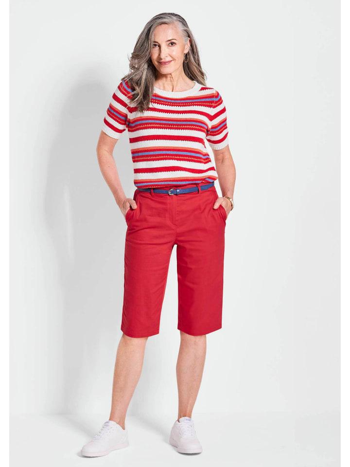Бермуды КАРЛА с поясом по форме и петлями для ремня. Эластичные удобные брюки с высоким содержанием хлопка и эластана обеспечивают максимальный комфорт при ношении и сопровождают каждое движение. Свободно облегающая штанина закрывает колено, боковые накладные карманы и накладные карманы с оптическим прицелом умело дополняют модель. Ширина подола около 54 см. Прямая линия ног.