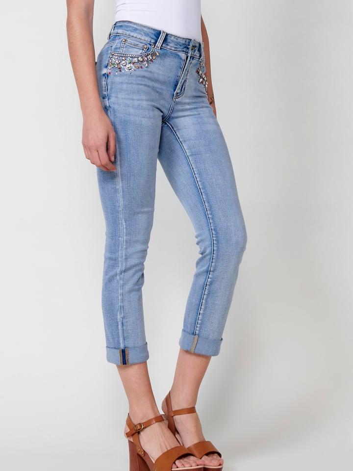 Узкие длинные джинсы с закатанным концом. Деталь из стразов на передних карманах. Состав 72% хлопок, 26% полиэстер, 2% спандекс.
