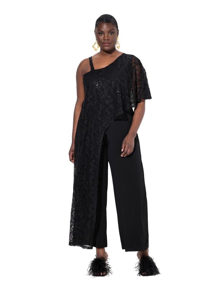 Комбинезон, топ-модный цельный костюм с широкими прямыми штанинами. Асимметричный плед из тонкого кружева с блестками, слева в виде выреза через плечо с полурукавом, справа - до подола. Бретельки для спагетти, застежка-молния сзади.материал