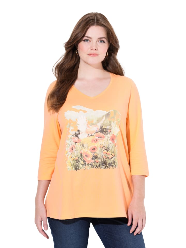 Футболка А-силуэта из гладкого трикотажа с натуральным рисунком. V-образный вырез, рукава 3/4.материал