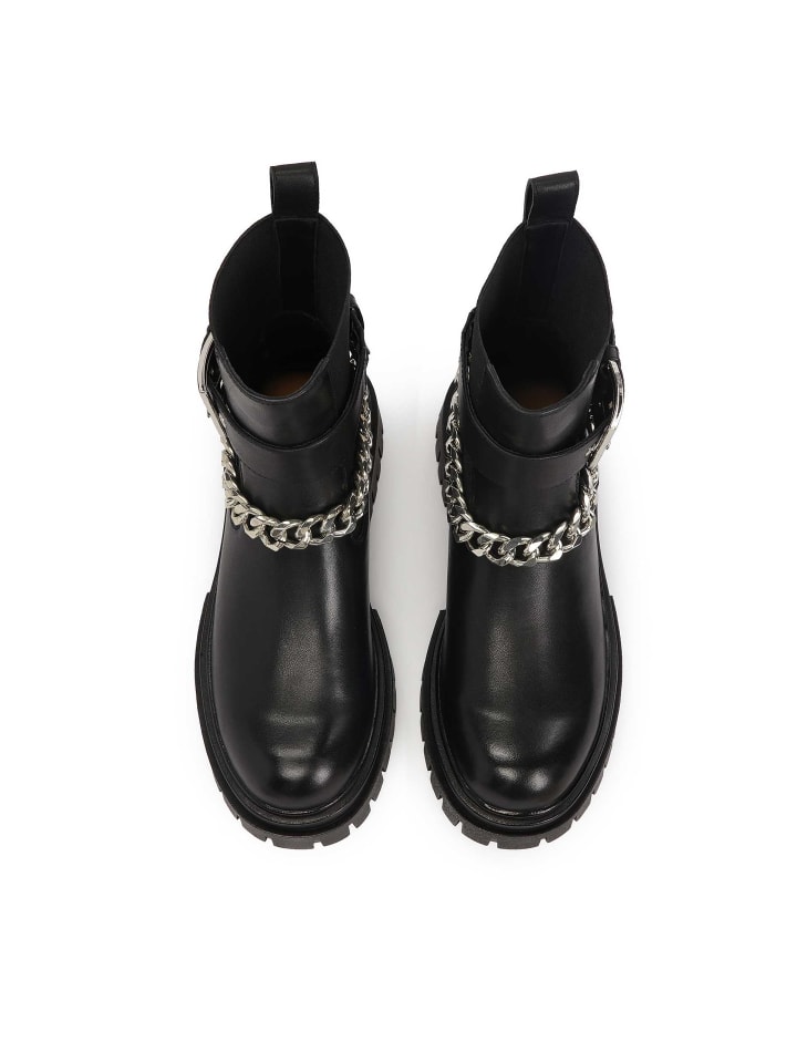 Ботинки из натуральной кожи на толстой подошве имеют прочный и модный дизайн и идеально подходят для повседневного использования в различных погодных условиях. Подошва с глубоким протектором обеспечивает отличное сцепление и устойчивость, что делает ее практичным выбором для скользких или неровных поверхностей. Голенище этих ботинок достигает щиколотки и легко надевается, что позволяет быстро надевать и снимать их. Эластичные вставки по бокам обеспечивают дополнительный комфорт и адаптируются к форме ноги. Туфли украшены яркой массивной цепочкой и ремешком с крупной пряжкой серебристого цвета, что придает им индивидуальность и отличает их от других моделей. Мягкая подкладка из овчины гарантирует высокий уровень комфорта, а подкладка из искусственного меха обеспечивает ощущение тепла в холодные дни. Материалы
