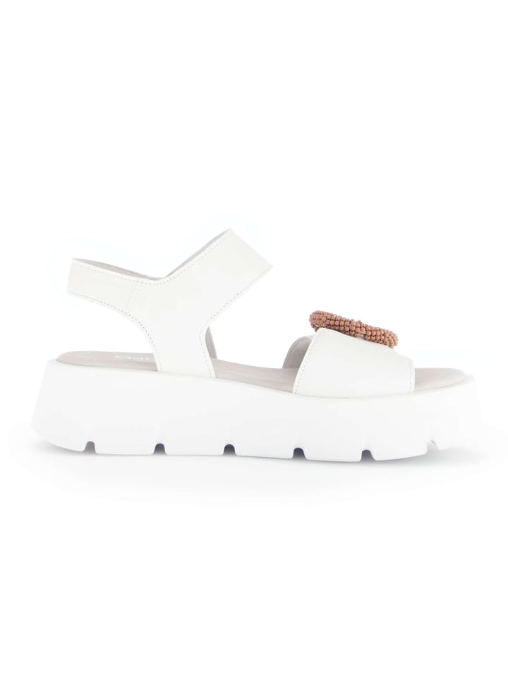 Модные и дополненные функциональными деталями, эти модные сандалии на платформе Gabor подойдут любой женской ноге. Белый верх выполнен из прочной гладкой кожи, что делает эти сандалии стильным выбором. Ширина обуви F (нормальная) означает, что сандалии идеально подходят для женских ног от узких до нормальных. Благодаря удобному оснащению, владелец радуется расширенной поверхности в области голени и большему комфорту.материал