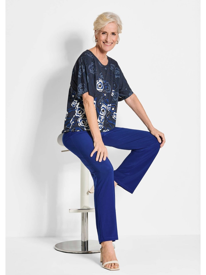 Рубашка с принтом с изысканным цветочным принтом. Облегающий крой с открытыми плечами и рукавами до половины длины умело скрывает фигуру. Благодаря резинке на подоле длину можно регулировать индивидуально. Женственные штрихи подчеркивают вырез лодочкой и слегка глянцевое качество трикотажа, что также упрощает уход за рубашкой. Длина ок. 66 см в гр. 46, около 62 см в гр. 23.