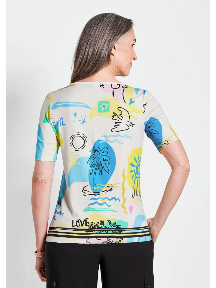Рубашка с цветным сплошным принтом, привлекающая всеобщее внимание. Высококонтрастная бордюрная полоска по подолу умело подчеркивает узор. С узким вырезом-лодочкой, прямыми подолами и рукавами до половины длины. Рубашка из удобного вискозного трикотажа, мягкая и удобная в носке - идеальный вариант для любого случая! Длина около 64 см в корпусе 46, около 60 см в корпусе 23.