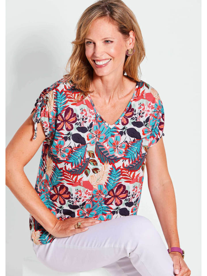 Рубашка с ярким цветочным принтом. Цветочный узор сияет особенно ярко и заставляет вас сиять. Изготовлен из высококачественного вискозного трикотажа для оптимального комфорта. V-образный вырез, а также сборка и ленты на плечах придают женственно-спортивный вид. Длина около 64 см в корпусе 46, около 60 см в корпусе 23.