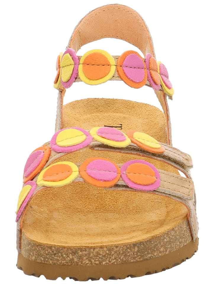 Эти сандалии от THINK! впечатляет их современный дизайн. Узор, состоящий из разноцветных кругов, проходит по всему пролету, привлекая внимание. Стелька из кожи обеспечивает комфортное ношение.