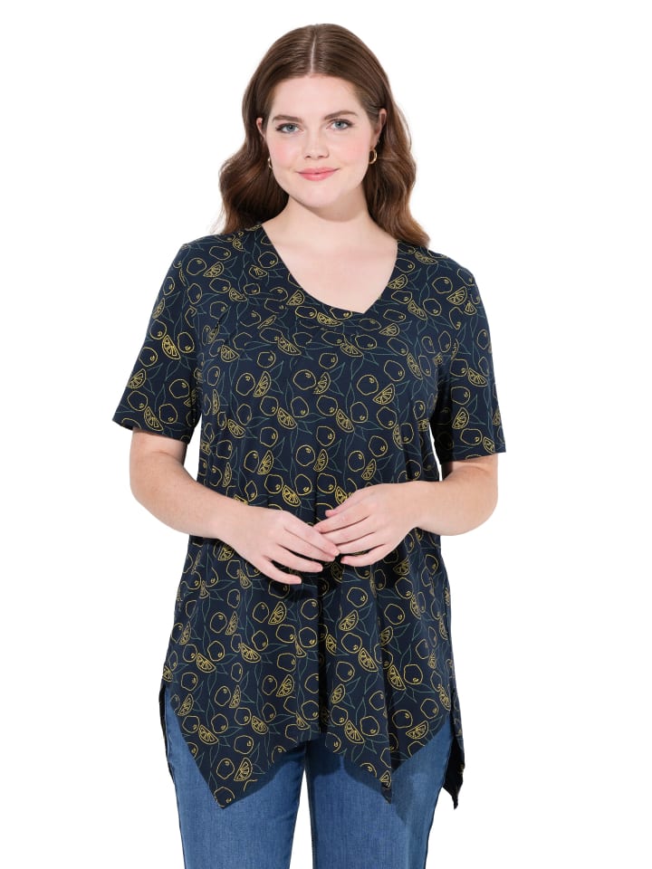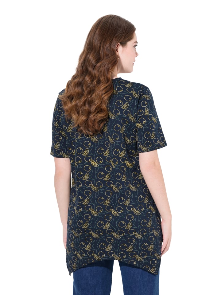 Футболка из органического хлопка. Удобная А-силуэтная форма из мягкого трикотажа с фруктовым рисунком. Привлекательный: асимметричный V-образный вырез с вырезом и вырезом по бокам. рукава 3/4, подол на конце. Organic; certified by ECOCERT Greenlife Licence no. 152026.materials