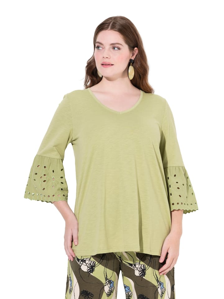 Футболка из органического хлопка. А-силуэта из трикотажного трикотажа с кружевным воланом на рукавах 3/4. Закругленный V-образный вырез, боковые прорези для плавного прилегания и еще большая свобода движений. Organic; certified by ECOCERT Greenlife Licence no. 152026.materials