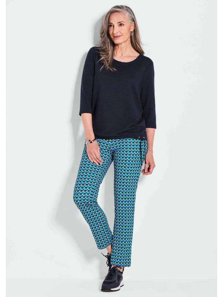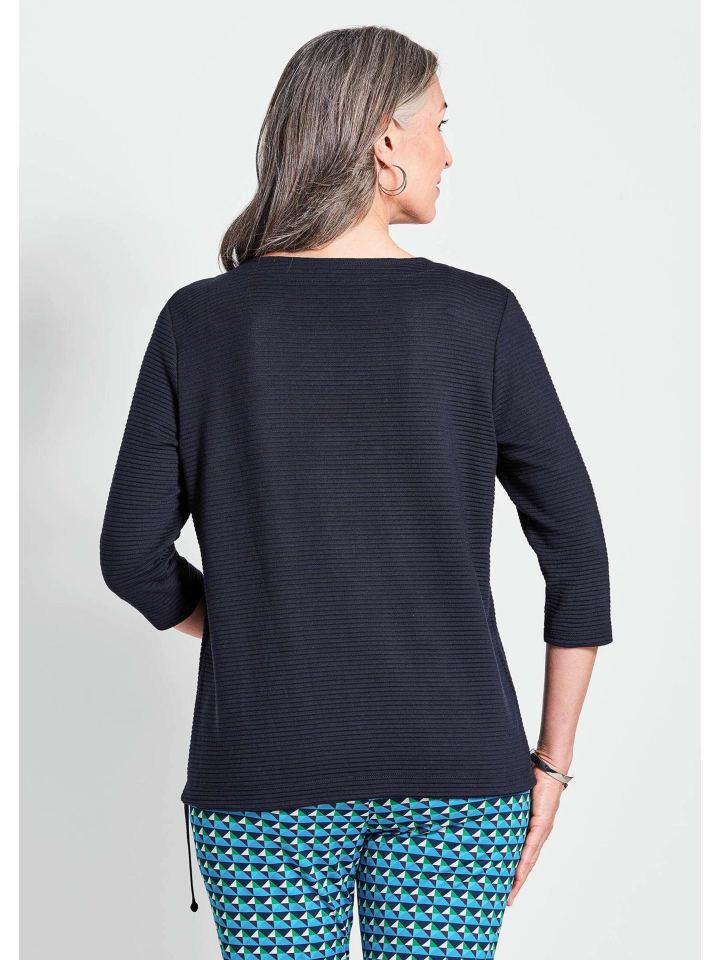 Свитер-рубашка с захватывающим поперечным рисунком в рубчик. Очень удобного в носке качества с большим количеством вискозы и спандекса. Регулируемый по ширине подол с цельными шнурами и металлическими петлями: идеально подходит для складывания и комбинирования на юбке. Прямой разрез. Вырез лодочкой со стеганой подкладкой, а также рукава на 3/4 с небольшим вырезом на плечах. Длина около 64 см в гр. 46, около 60 см в гр. 23.