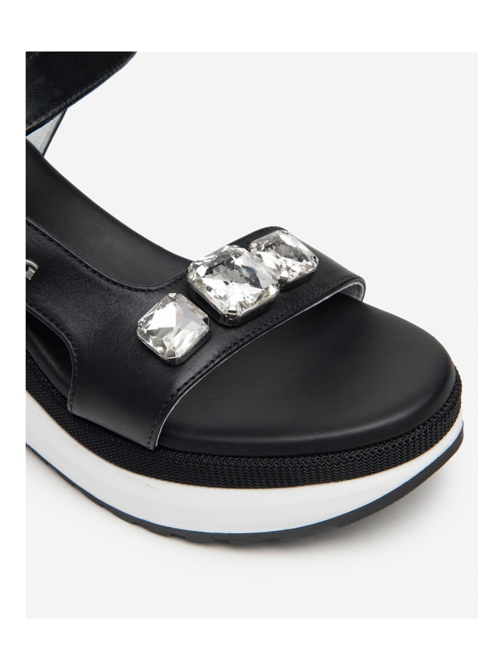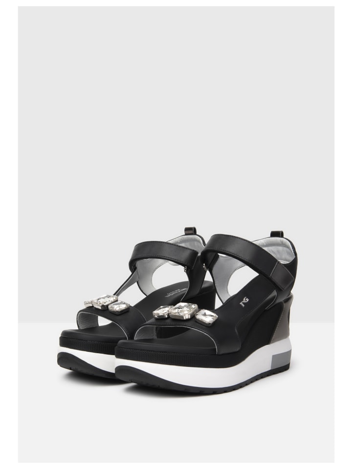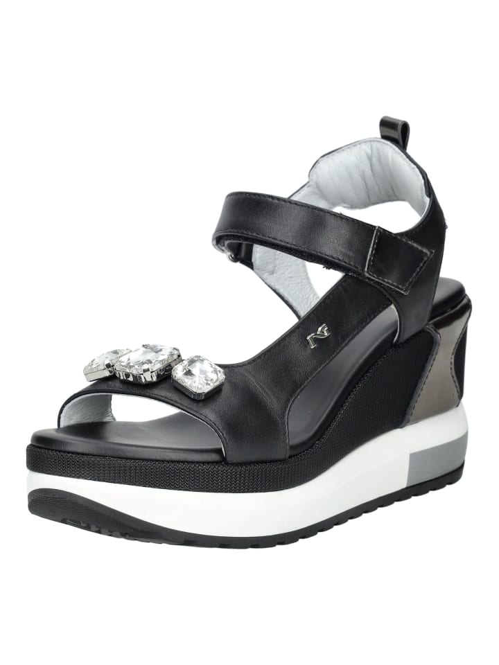 Эти модные и современные босоножки на платформе от Nero Giardini с превосходным качеством и сочетанием кожи и текстиля позволят вам всегда быть стильно одетыми в важных случаях! Благодаря отделке на липучке, эта повседневная и эксклюзивная обувь сделает вашу повседневную жизнь заметно приятнее. Абсолютно привлекательны декоративные камни на гигантском ремешке!