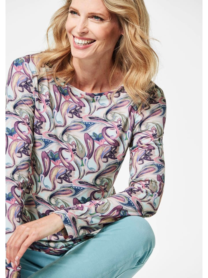 Рубашка с ярким рисунком пейсли в акварельном стиле, которую можно сочетать со многими нарядами из вашего гардероба. Женственный вырез-лодочка с узкой каймой облегает плечи, а длинные руки сохраняют приятное тепло. Изготовлен из мягкого вискозного трикотажа, который следит за каждым вашим движением. Часть хорошего настроения, которая вызовет улыбку на вашем лице даже в пасмурные дни.Длина около 64 см в гр. 46, около 60 см в гр. 23.