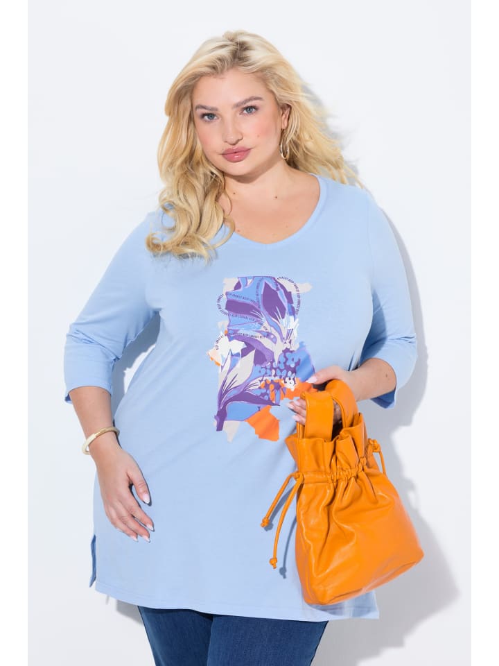 Длинная рубашка А-силуэта из мягкого трикотажа с цветочным принтом. V-образный вырез, рукава 3/4. Боковые прорези для гладкого чехла.материал