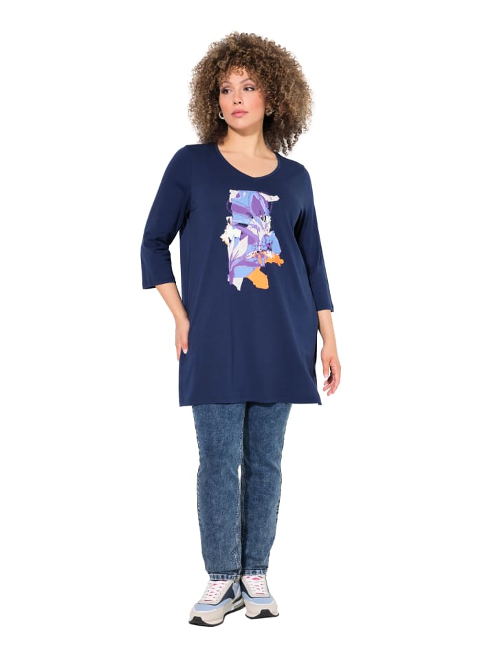 Длинная рубашка А-силуэта из мягкого трикотажа с цветочным принтом. V-образный вырез, рукава 3/4. Боковые прорези для гладкого чехла.материал