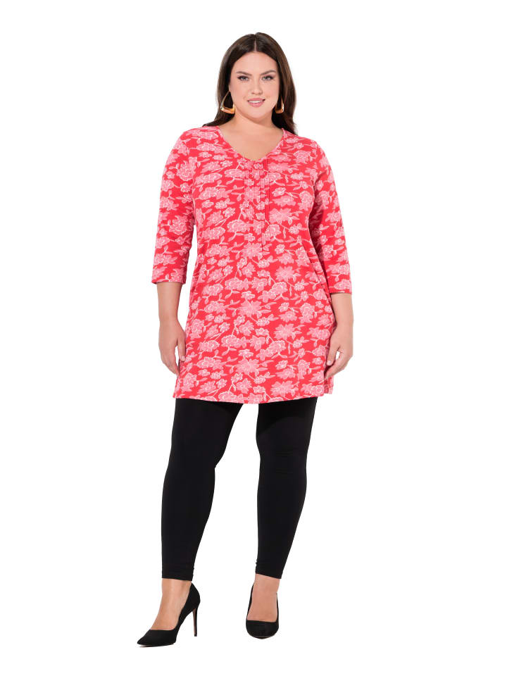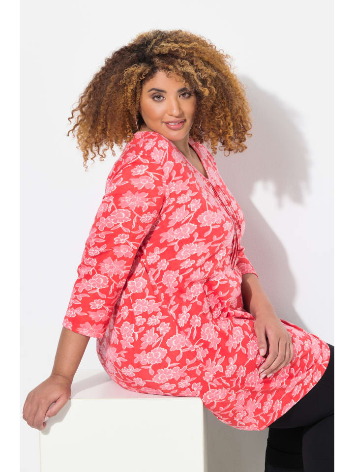 Длинная рубашка А-силуэта с вырезом на груди. V-образный вырез с вырезом на груди, рукава 3/4. Гофрированный поперечный шов, карманы по бокам, удобная ширина подола.материал