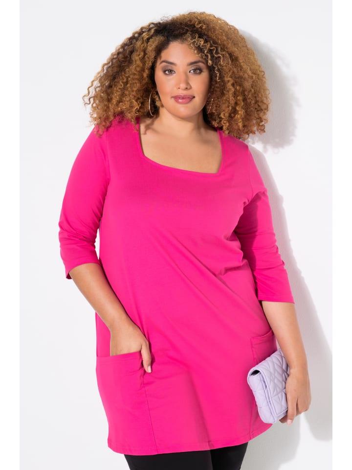 Длинная рубашка А-силуэта с накладными карманами. Вырез каре и рукава 3/4. Удобная ширина подола.материал