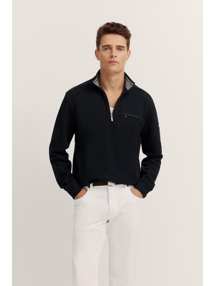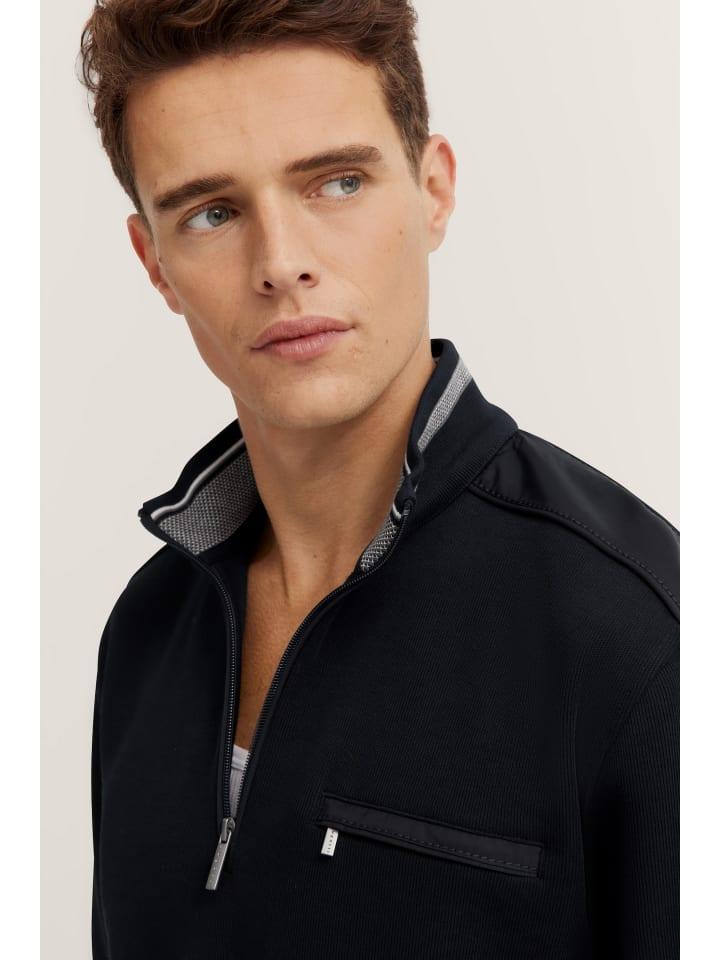 Bugatti Sweat-Troyer с обычной посадкой сочетает в себе стильные детали с высоким комфортом. Нейлоновые элементы и контрасты на воротнике-стойке придают тройке современный вид, а практичный карман на рукаве и металлическая бляшка с логотипом на воротнике придают ей особый вид. Идеально подходит для спортивного и элегантного образа.