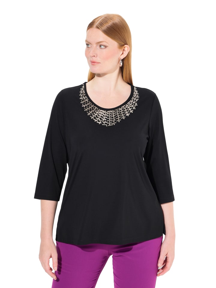 Футболка классической формы из мягкого вискозного джерси с элегантной металлической отделкой колье на вырезе. Рукава 3/4, прорези по бокам для гладкого прилегания.материал