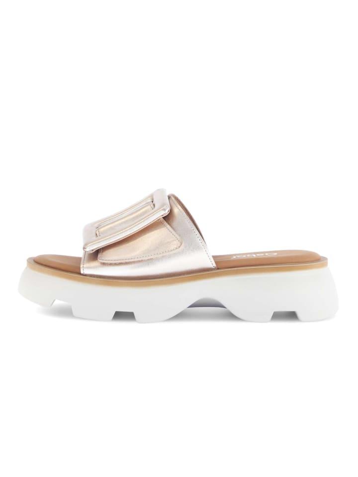 Модные и дополненные функциональными деталями, эти удобные мулы Gabor comfort подойдут любой женской ноге. Золотой верх выполнен из высококачественной эффектной кожи, что делает эти сандалии стильным выбором. Ширина обуви G (средняя) означает, что сандалии идеально подходят для обычных женских ступней шириной выше средней. Сандалии линии comfort обладают большим объемом в области бурсита и подъема, а также дополнительным пространством для пальцев ног и обеспечивают устойчивость стопы.материал