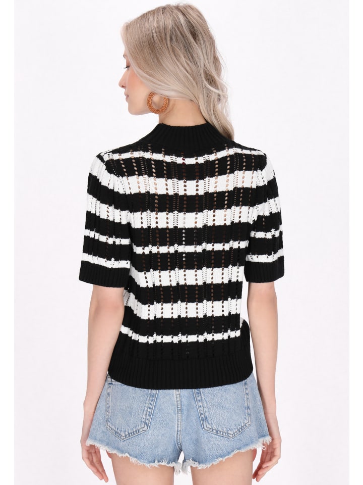 Introducing a stylish addition to your wardrobe - this top features a regular fit with a stand collar and short sleeves. The knitted design showcases stripes and ajour patterns, giving it a casual yet trendy look perfect for everyday fashion. Comfortable and chic, this top from the Boho Collection pairs effortlessly with denim shorts for a laid-back vibe.