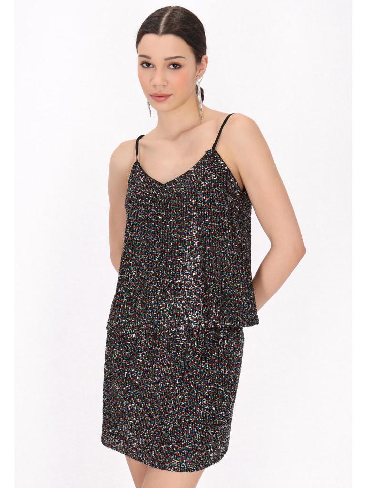 Discover this trendy sleeveless top, designed in a regular fit and a stylish scoop neck. Delicate thin straps enhance its elegance, while reflective sequins add a dazzling touch of glamour. Made from mesh, it boasts a chic, shiny look for added comfort. Perfect for young fashion lovers seeking sophisticated evening wear—part of our exclusive Evening Collection!