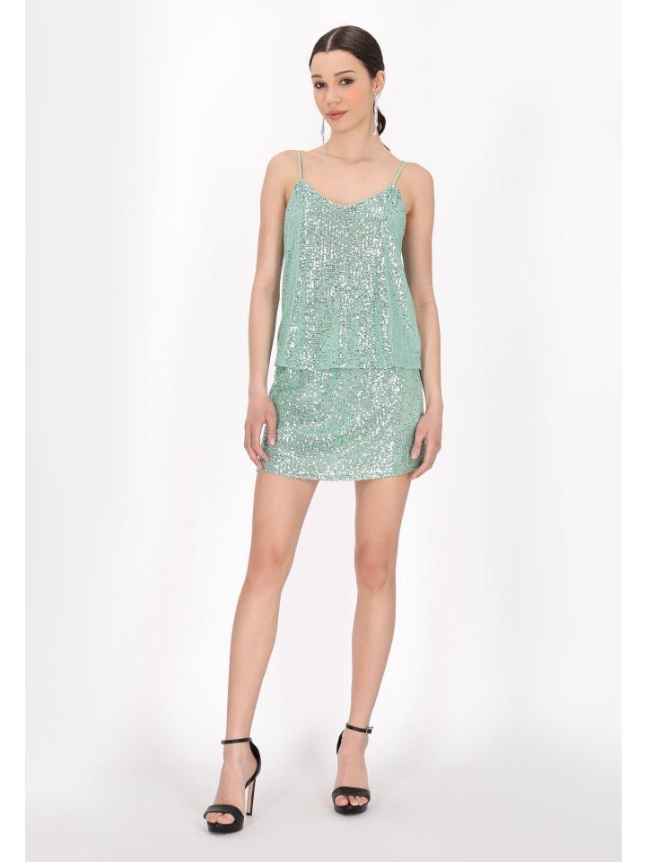 Discover this trendy sleeveless top, designed in a regular fit and a stylish scoop neck. Delicate thin straps enhance its elegance, while reflective sequins add a dazzling touch of glamour. Made from mesh, it boasts a chic, shiny look for added comfort. Perfect for young fashion lovers seeking sophisticated evening wear—part of our exclusive Evening Collection!