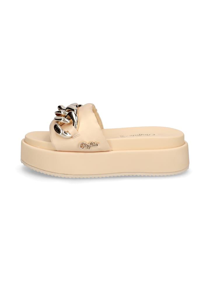 Текстильные женские мулы на платформе Vegan Buffalo на платформе золотого цвета с декором в виде золотой цепочки и мягкой текстильной подкладкой.материал
