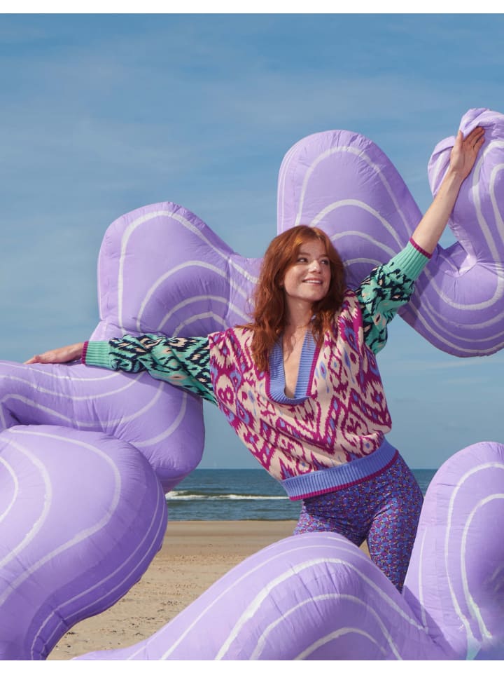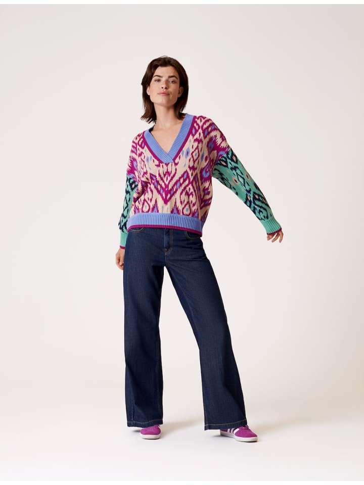 Этот игривый жаккардовый вязаный свитер в стиле Икат имеет элегантный V-образный вырез с широким вырезом. Контрастные рукава с веселыми красочными узорами делают этот свитер по-настоящему привлекательным.- 100% сертифицированная GOTS пряжа из органического хлопка- Облегающий материал большого размера