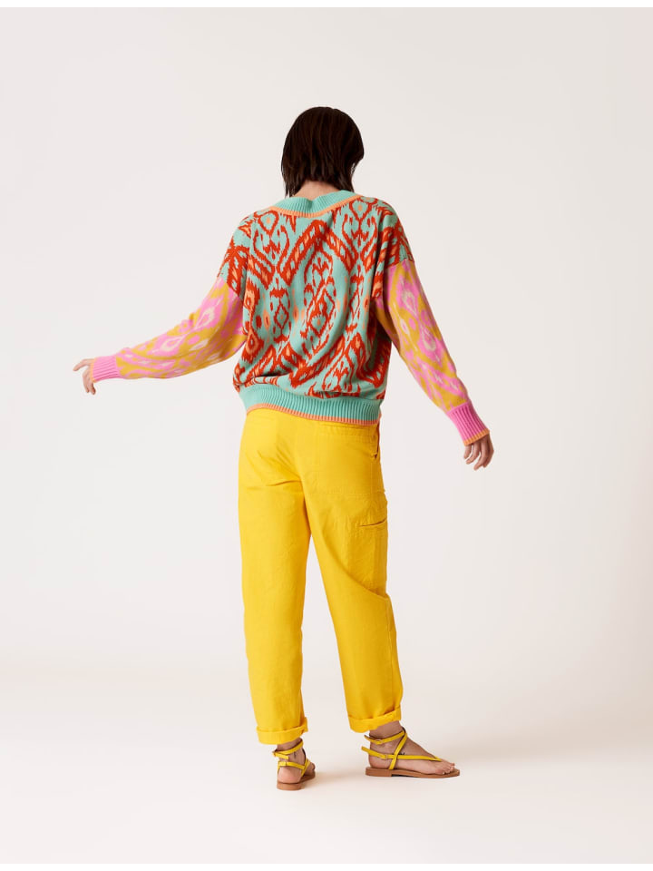 Этот игривый жаккардовый вязаный свитер в стиле Икат имеет элегантный V-образный вырез с широким вырезом. Контрастные рукава с веселыми красочными узорами делают этот свитер по-настоящему привлекательным.- 100% сертифицированная GOTS пряжа из органического хлопка- Облегающий материал большого размера