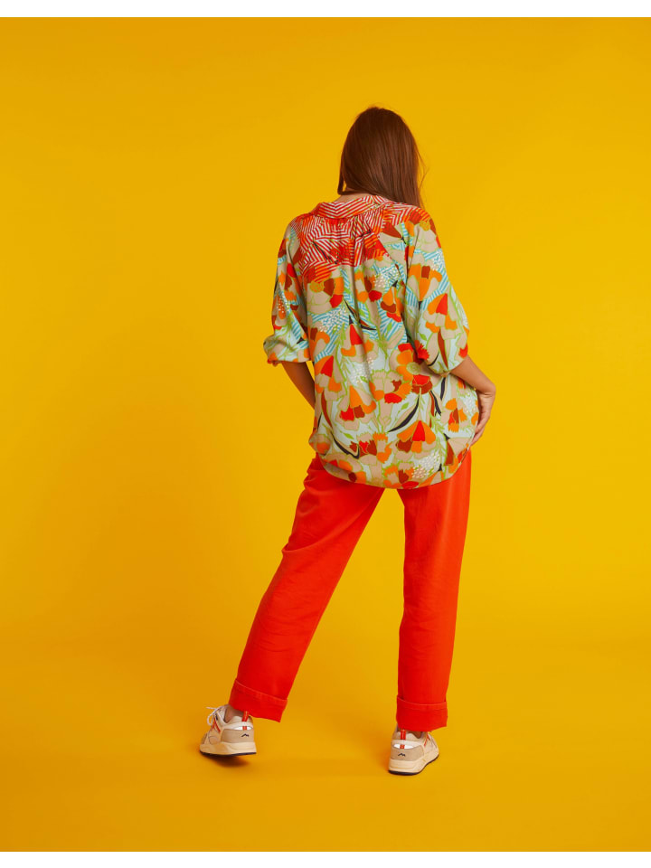 Мягкая струящаяся блузка с пышным принтом в виде гвоздики. Разместив полоски поверх цветов, мы подчеркнули плечи и вырез декольте, придав им дополнительный эффектный вид. - 100% FSC сертифицированный вискозный V-образный вырез Материал