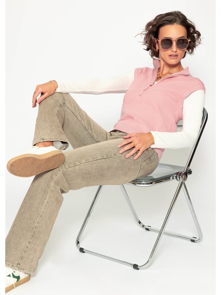 Этот современный вязаный топ отличается универсальной элегантностью и приятным комфортом. Тонкий трикотаж придает дизайну изысканный вид, а тонкая ребристая текстура придает стильный вид. Особой изюминкой является застежка-молния на воротнике-стойке, которую можно настроить индивидуально: топ выглядит классически и элегантно в закрытом виде, а в открытом виде создается женственный V-образный вырез, который красиво подчеркивает декольте. Слегка свободная посадка обеспечивает высокий комфорт и делает топ гибким партнером в укладке, идеально подходящим для повседневного образа с джинсами или элегантного сочетания с тканевыми брюками.