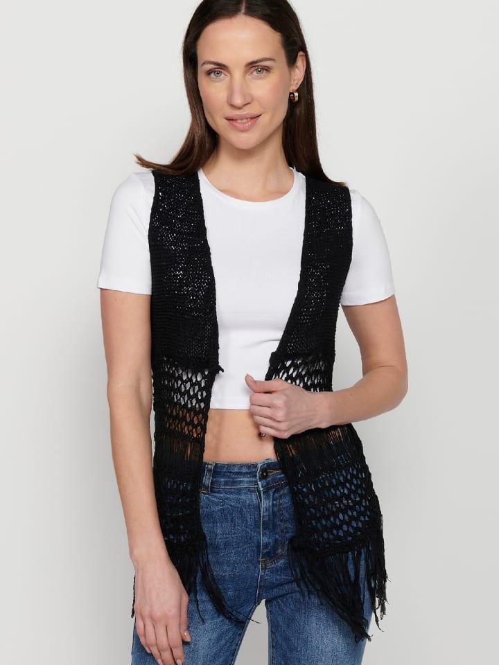 Жилет без рукавов. Отделка бахромой. Ажурное вязание. Состав 60% акрил 40% полиэстер