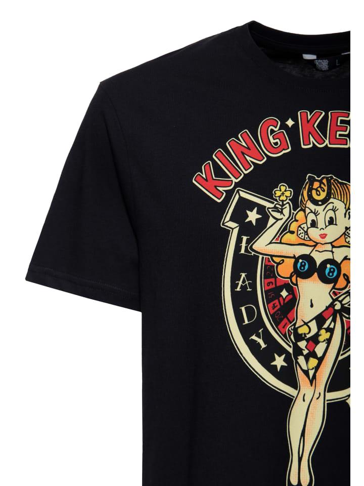 Поднимите свою удачу на новый уровень с футболкой King Kerosin „Lady Luck“! Мультяшный принт сочетает в себе очаровательную леди с классическими символами удачи, создавая неповторимый винтажный образ. Рубашка, изготовленная из чистого хлопка, обеспечивает комфортное ношение и долговечность. Классический круглый вырез и удобная регулярная посадка делают его идеальным для любого случая – будь то непринужденный или дикий. Тонкая деталь с логотипом на подоле добавляет завершающий штрих. С этой футболкой вам повезет не только в игре, но и в стиле!