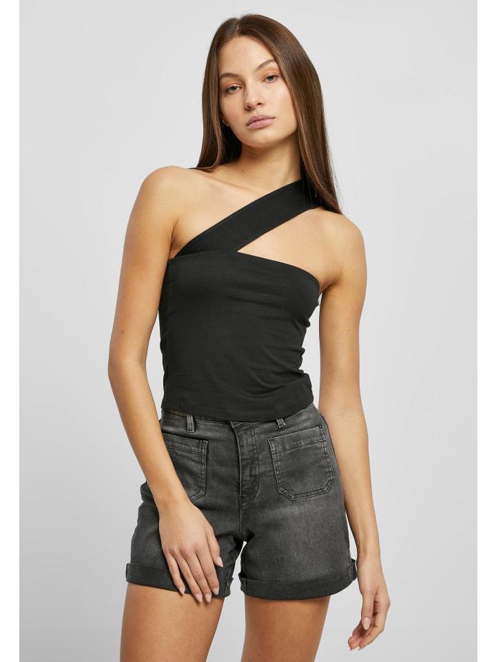 Женский топ обладает прекрасной динамикой, которая достигается с помощью ремешка, проходящего по диагонали через грудь и спускающегося прямо вниз на спине. Спереди он скроен на животе и в целом плотно прилегает к телу. Верх выполнен из хлопка и небольшого количества спандекса.
