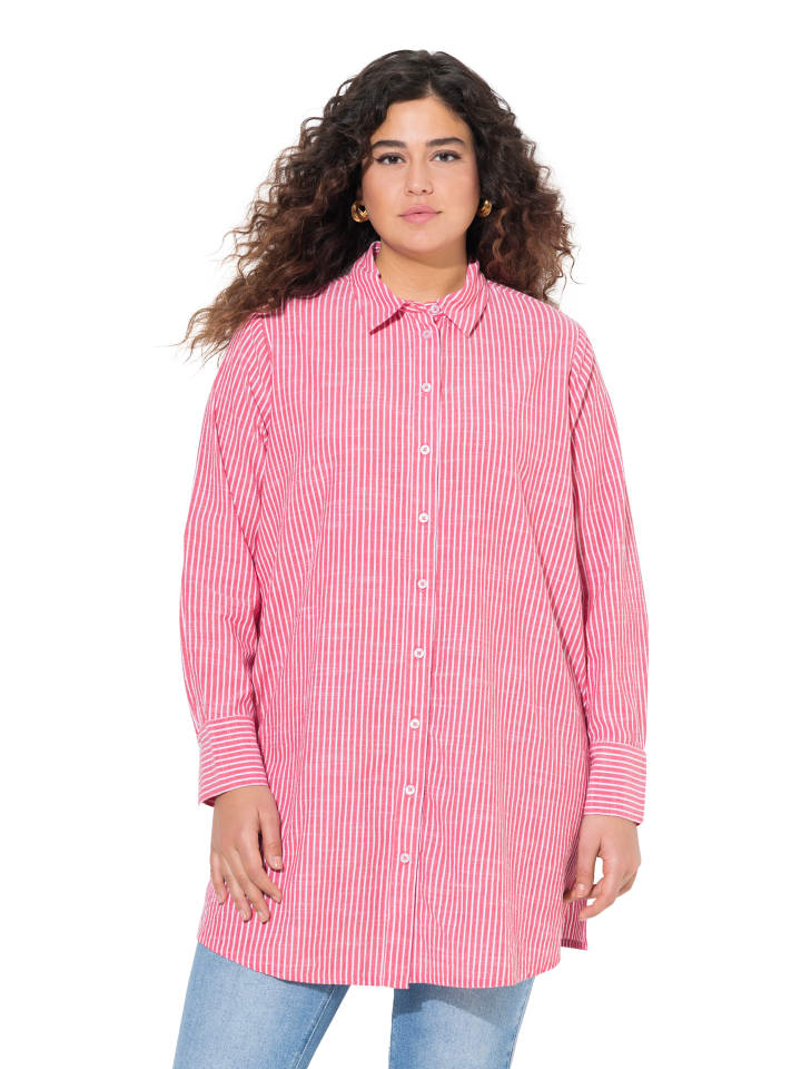Длинная блузка А-силуэта в полоску. Воротник рубашки, планка на пуговицах, длинный рукав с манжетами. Подол с разрезами по бокам, закругленный сзади и длиннее.материал