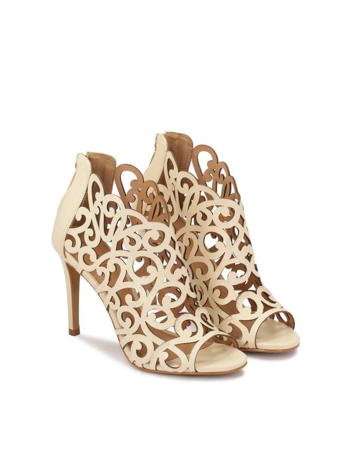 Ботильоны кремового цвета с открытым носком из натуральной кожи — элегантный и стильный выбор для разных случаев. Особенностью этих сапог являются ажурные вырезы на голенище, которые придают им легкость и утонченную женственность. Открытый носок делает их идеальными для теплых дней, так как он обнажает пальцы ног и придает вашему стилю нотку непринужденности. Узкий высокий каблук-шпилька придает туфлям нотку шика и стройнит силуэт, делая их очень чувственными. Сзади голенища расположена практичная молния, благодаря которой сапоги легко надевать и снимать, сохраняя при этом их элегантный вид.